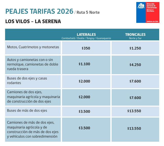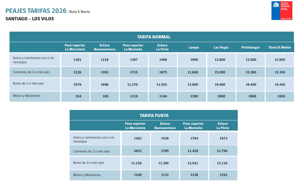 Recuerda que estas tablas únicamente muestran los pórticos de peaje sobre la Ruta 5 y algunos laterales. Además de eso, debes considerar los pagos que deberás hacer por el TAG, puesto que debes atravesar la Autopista Central y eventualmente otra autopista para salir de Santiago rumbo al norte.